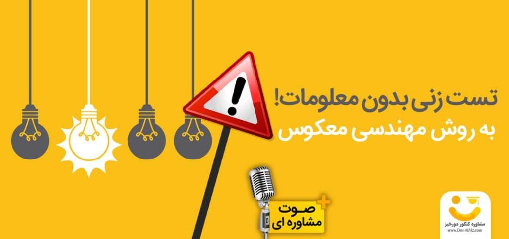 تست زنی به روش مهندسی معکوس یا تست زنی بدون معلومات چقدر حقیقت دارد؟! آیا واقعاً بدون درس خواندن و تلاش کردن می توان تست های کنکور را درست جواب داد؟ آیا خرید تعداد زیادی کتاب و شرکت در کلاس کنکور و یادگیری روش های صحیح مطالعه و یادگیری همه و همه بیهوده است؟ روش تست زنی معکوس ادعا می کند بدون خرید کتاب کنکور و بدون خواندن آن ها و داشتن معلومات و دانش و تلاش قبلی می توان در کنکور موفق شد!! ما در وبسایت دورخیز روش مهندسی معکوس در تست زنی را به شکل مفصل بررسی می کنیم و پاسخ این سوالات را به شما خواهیم داد. پس با ما همراه باشید😍